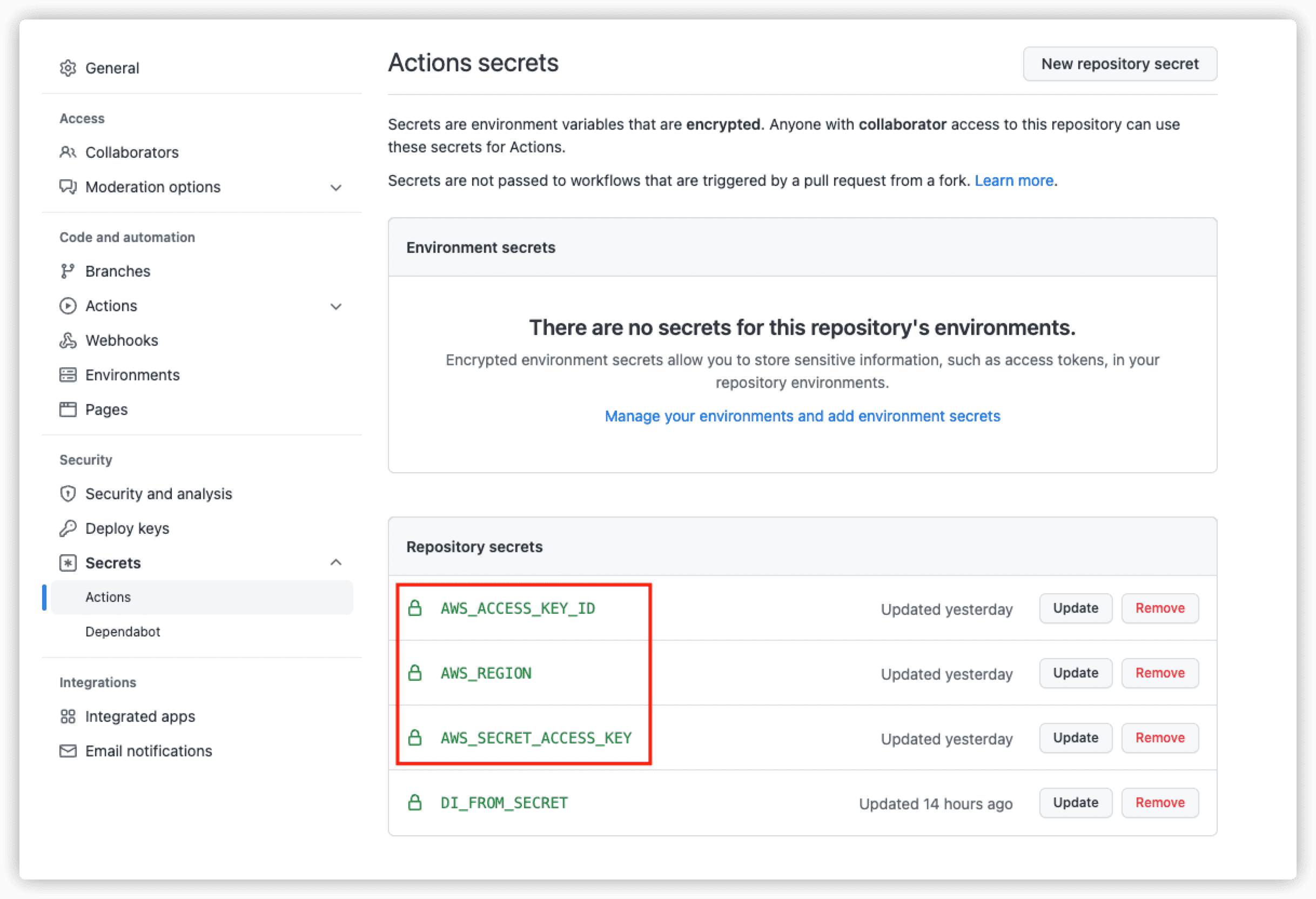 - Github Repository -> Settings -> Secrets -> Actions에 정의해놓은 값들이 주입된다.