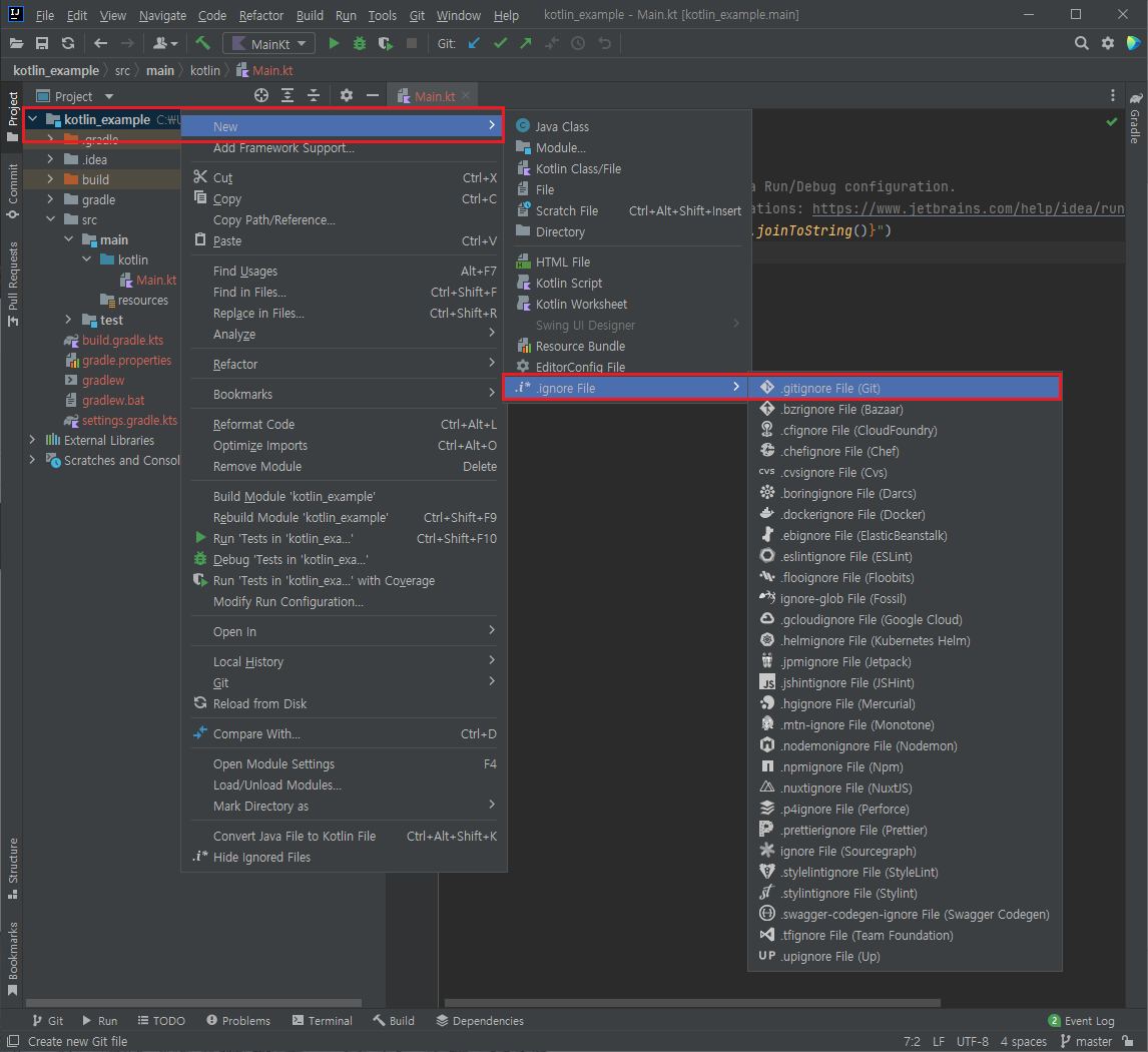 설치 후 프로젝트에서 New를 보면 ignore File이 생긴 것을 확인할 수 있다. 여기서 .gitignore File (Git)을 선택한다.