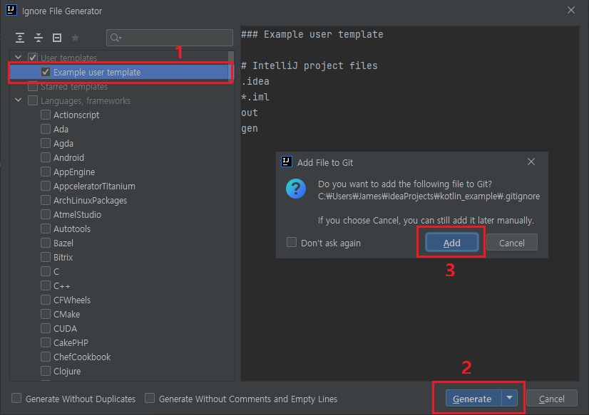 Ignore File Generator 창이 뜨면 좌측에서 Example user template 선택한다. (또는 본인에게 맞는 설정을 찾아서 선택하면 된다.) 그 후 Generate를 통해 생성하고 Add를 누른다.