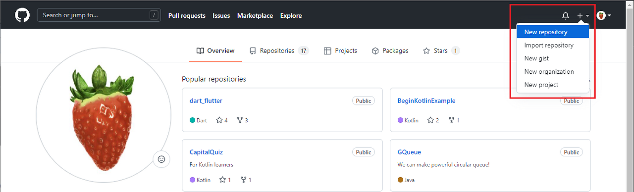 GitHub에 로그인 후 우측 상단의 + 버튼을 눌러서 새로운 repository를 생성한다.