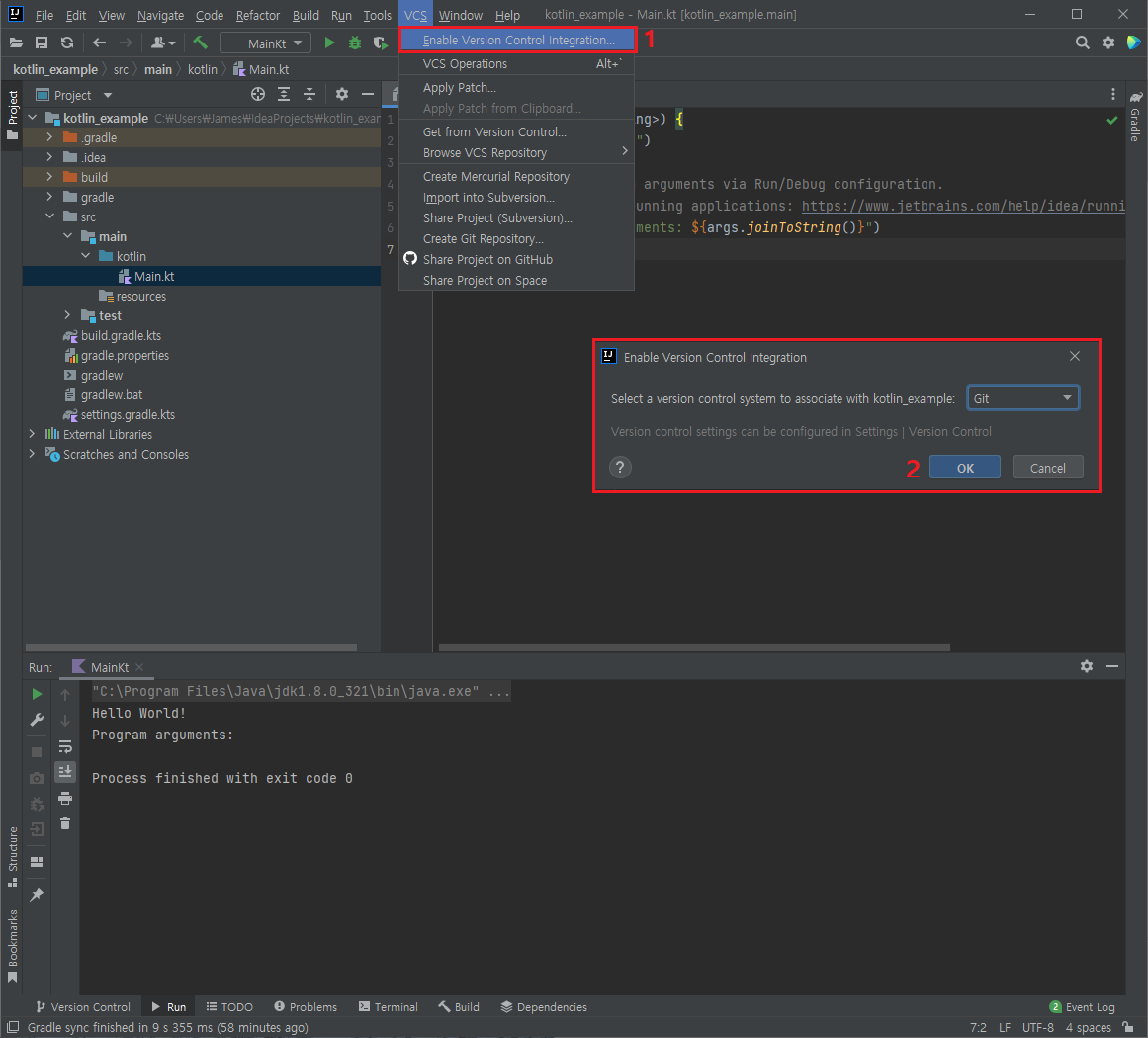 메뉴에서 VCS를 선택한 후 Enable Version Control Integration을 선택한다. 그러면 새로운 창이 하나 뜨는데 거기서 Git을 선택한 후 OK를 누른다.