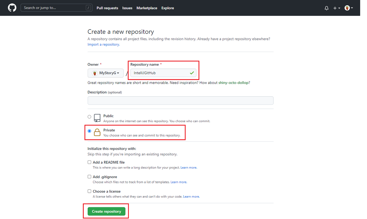 그 후 Repository 명을 입력하고 공개 여부를 결정하고 생성한다.