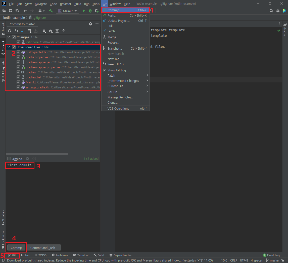 그러면 좌측에 아직 Git에 추가되지 않은 파일 목록이 보이는데 ignore에 등록된 부분의 파일들은 무시되어 보이지 않는다. 따라서 반영이 불필요한 부분은 쉽게 거를 수 있다. 반영할 파일들을 선택하고 Commit 메시지를 작성 후 좌측 하단의 Commit을 누른다. 그러면 그 아래 Git이라는 메뉴가 생긴다.