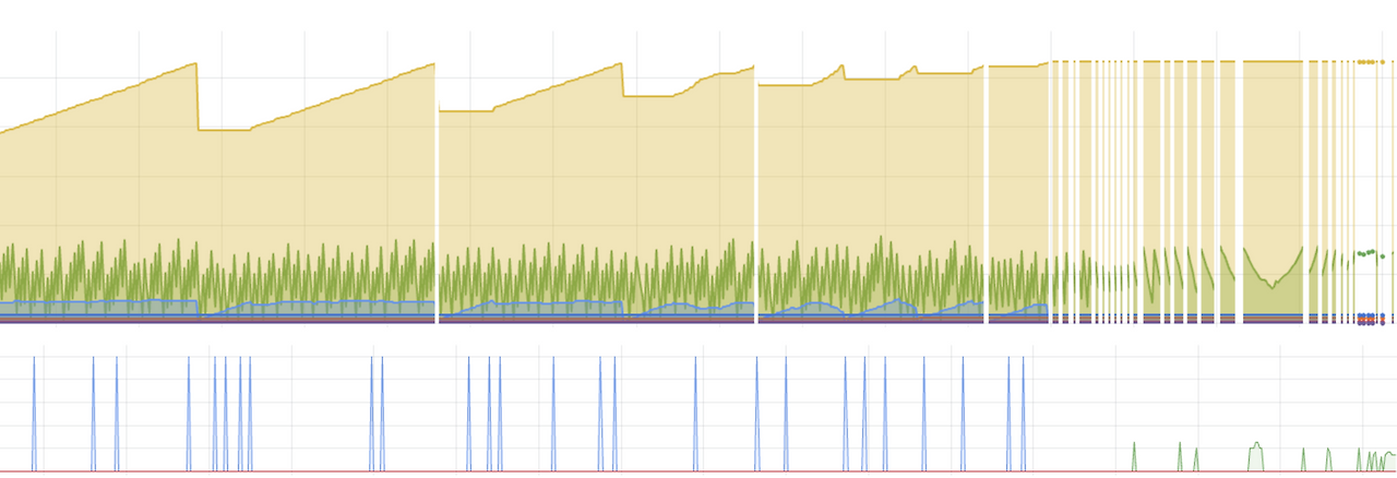 GC 동작 이후에도 Old Gen의 최저 수위가 점점 높아지는 것을 볼 수 있습니다. Major GC의 처리 대상이 되지 못하는 누수가 계속 쌓이고 있고, 결국 Old gen이 메모리를 가득 채워 OOM이 발생했습니다.